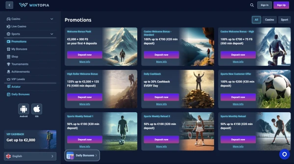 I giocatori italiani possono richiedere un’offerta di benvenuto in quattro step dopo la registrazione. Primo deposito: 100% fino a €700 + 75 Free Spins, con deposito minimo di €20. Secondo deposito: 100% fino a €300 + 75 Free Spins, con deposito minimo di €20. Terzo deposito: 50% fino a €500 + 50 Free Spins, con deposito minimo di €20. Quarto deposito: 50% fino a €500 + 50 Free Spins, con deposito minimo di €20. Per ogni step su Wintopia Casino, il wagering è 50x (bonus + deposito), quindi suggeriamo di scegliere una puntata adatta al tuo budget e al tempo disponibile.
