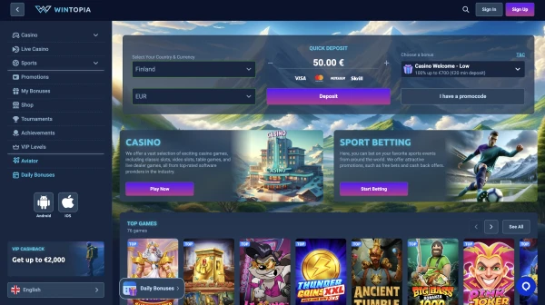 Supportiamo iOS e Android tramite browser, ma al momento non è disponibile un’app Wintopia installabile su nessuna delle due piattaforme. Anche senza download, puoi accedere alle impostazioni dell’account, al caricamento KYC e alle funzioni di cassa da mobile. Per le migliori prestazioni, consigliamo di mantenere aggiornato il browser e usare una connessione Wi-Fi o 4G/5G stabile.